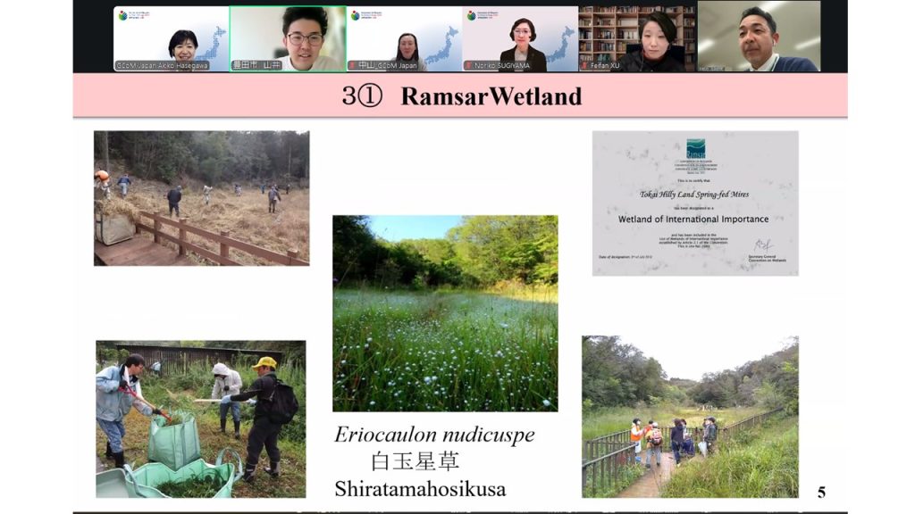 豊田市内にあるラムサール条約湿地の保全の取り組みでは市民と一緒に保全対策をおこなっているいこと。その湿地には国内でもこの伊勢湾周辺にしか生育していないシラタマホシクサ(白玉星草)は可憐な花を咲かせるが、富栄養化すると他の植物に負けてしまうため、貧栄養状態にするために草刈りなどの保全対策を市民と一緒に実施していること。自然と開発の両立をはかった多自然川づくりの試みや企業緑地が自然共生サイトへ登録することによって、生態系ネットワークの飛び石としてネットワークを強化していることを紹介しました。その後は、各3つのテーマにそって簡潔に、解説くださいました。