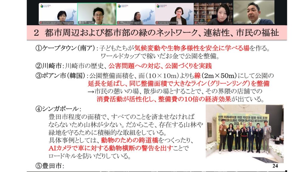 2026年2月5日(木)午後4時~5時のGCoM Cafeで、昨年10月23日(木)ー24日(金)に韓国漣川(ヨンチョン)で実施された「漣川自然との平和に関する世界フォーラム」に参加した報告を豊田市の山井さんが行いました。このフォーラムにはテーマが3つあり、1つ目は、ヨンチョンにあるDMZ(非武装地帯)には、湿地が多く存在しタンチョウなど多くの水鳥が生育していることから、「国境を越えた水鳥の保護」がテーマになっています。2つ目は都市周辺および都市部の緑のネットワーク、連結性と市民の福祉をテーマとして、街づくりと生物多様性、気候変動の適応策としても議論されました。3つ目は、「自然との共存に向けたインセンティブ政策をどのようにしていくかが議論となりました。
